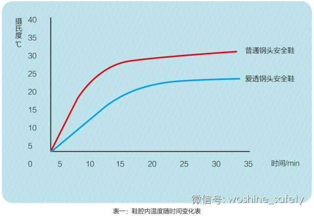 同样工作情况下穿着使用爱透钢头的安全鞋,鞋腔内温度升高缓慢,25分钟后鞋腔内温度升至25℃,并趋于稳定。