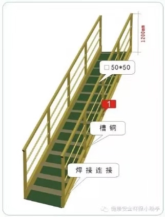 2、固定式直爬梯应用金属材料制成。梯宽不应大于50cm,支撑应采用不小于L70X6的角钢,埋设与焊接均必须牢固。梯子顶端的踏棍应与攀登的顶面平齐,并加设1~1.5m高的扶手。